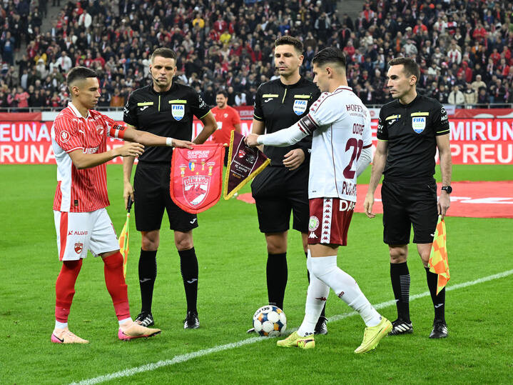 Descriere: Brigada de arbitrii formată din Mihai Marius Marica, Marian Barbu si George Florin Neacsu alături de căpitanii Catalin Ionut Cirjan si Mihai Alexandru Dobre la meciul de fotbal dintre Dinamo Bucuresti si Rapid Bucuresti, din cadrul Superligii Superbet, desfasurat pe Arena Nationala din Bucuresti, duminica 19 octombrie 2025. © FOTO:Razvan Pasarica/SPORT PICTURES