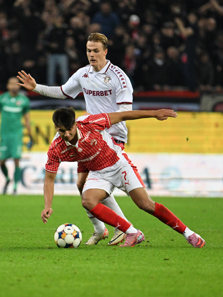 Descriere: Alexandru Marian Musi si Tobias Christensen in meciul de fotbal dintre Dinamo Bucuresti si Rapid Bucuresti, din cadrul Superligii Superbet, desfasurat pe Arena Nationala din Bucuresti, duminica 19 octombrie 2025. © FOTO:Razvan Pasarica/SPORT PICTURES