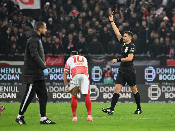 Descriere: Arbitrul central Marian Barbu acordă un cartonaș roșu in meciul de fotbal dintre Dinamo Bucuresti si Rapid Bucuresti, din cadrul Superligii Superbet, desfasurat pe Arena Nationala din Bucuresti, duminica 19 octombrie 2025. © FOTO:Razvan Pasarica/SPORT PICTURES