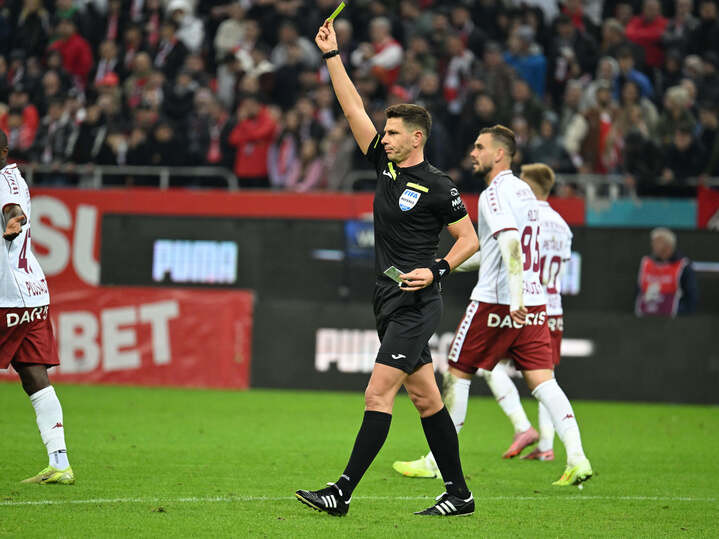 Descriere: Arbitrul central Marian Barbu acordă un cartonaș galben in meciul de fotbal dintre Dinamo Bucuresti si Rapid Bucuresti, din cadrul Superligii Superbet, desfasurat pe Arena Nationala din Bucuresti, duminica 19 octombrie 2025. © FOTO:Razvan Pasarica/SPORT PICTURES