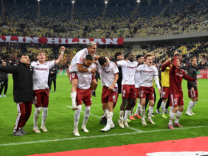 Descriere: Fotbalistii rapidisti Luka Gojkovic, Constantin Grameni, Cristian Marian Manea, Abdul Kader Keita, Tobias Christensen, Claudiu Adrian Mihai Petrila si Timotej Jambor se bucura dupa meciul de fotbal dintre Dinamo Bucuresti si Rapid Bucuresti, din cadrul Superligii Superbet, desfasurat pe Arena Nationala din Bucuresti, duminica 19 octombrie 2025. © FOTO:Razvan Pasarica/SPORT PICTURES