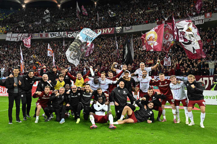 Descriere: Fotbalistii rapidisti se bucura intr-o fotografie de grup alături de staff si galerie realizata dupa victoria din meciul de fotbal dintre Dinamo Bucuresti si Rapid Bucuresti, din cadrul Superligii Superbet, desfasurat pe Arena Nationala din Bucuresti, duminica 19 octombrie 2025. © FOTO:Razvan Pasarica/SPORT PICTURES