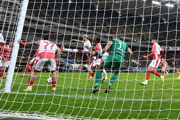 Descriere: Cristian Marian Manea, Vhakka Eddy Stelh Gnahore, Devis Rogers Epassy Mboka si Stipe Perica la faza primului gol rapidist marcat in meciul de fotbal dintre Dinamo Bucuresti si Rapid Bucuresti, din cadrul Superligii Superbet, desfasurat pe Arena Nationala din Bucuresti, duminica 19 octombrie 2025. © FOTO:Razvan Pasarica/SPORT PICTURES