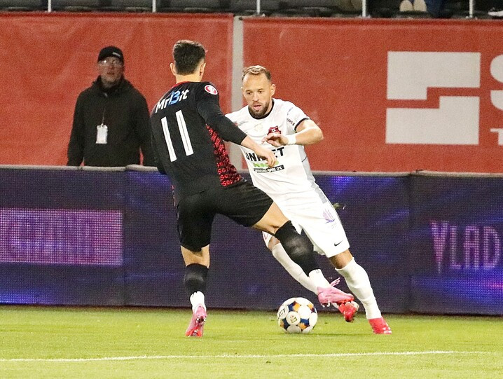 Descriere: Cristian Daniel Negut si Francisco Anderson Ceará in meciul de fotbal dintre AFC Hermannstadt Sibiu si FK Csikszereda Miercurea Ciuc, contand pentru Superliga Superbet, desfasurat pe Stadionul Municipal din Sibiu, luni 20 octombrie 2025. © FOTO:Valentin Macrea/SPORT PICTURES