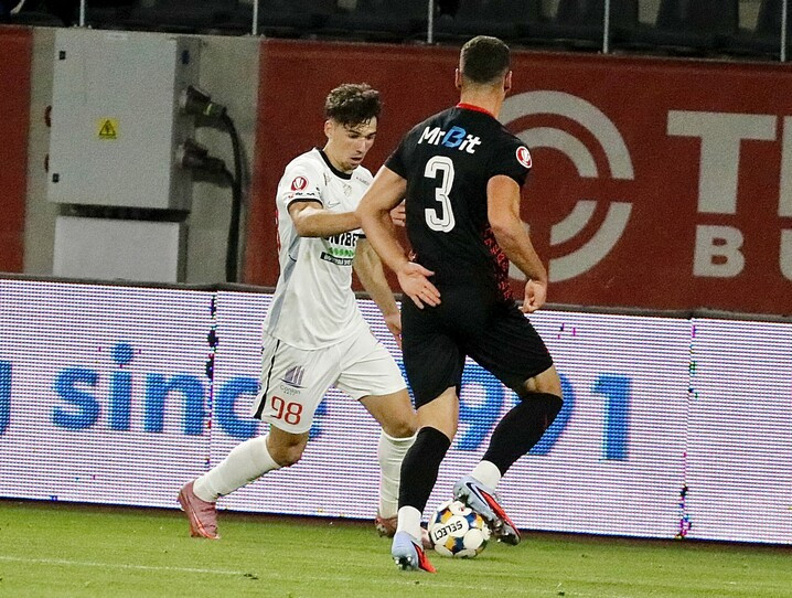 Descriere: Kevin Andrei Ciubotaru si Raul Ioan Palmes in meciul de fotbal dintre AFC Hermannstadt Sibiu si FK Csikszereda Miercurea Ciuc, contand pentru Superliga Superbet, desfasurat pe Stadionul Municipal din Sibiu, luni 20 octombrie 2025. © FOTO:Valentin Macrea/SPORT PICTURES