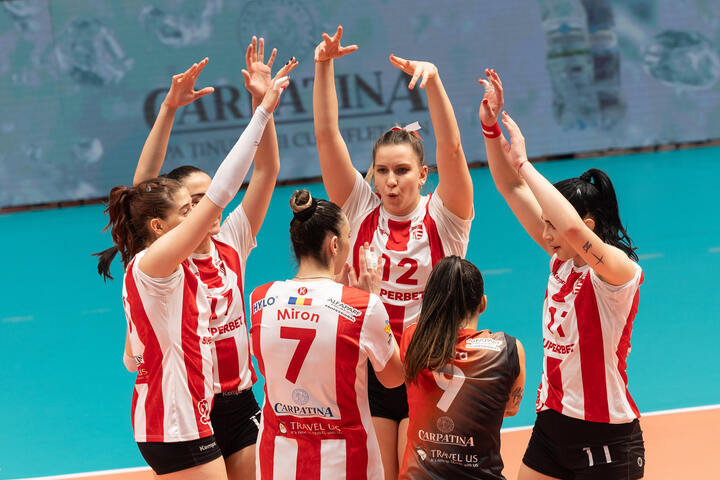 Descriere: Voleibalistele dinamoviste se bucura dupa un punct obtinut in meciul de volei feminin dintre CS Dinamo Bucuresti si CSM Corona Brasov, contand pentru Divizia A1 Feminin, desfasurat in Sala Polivalentă Dinamo din Bucuresti, sambata 5 aprilie 2025. © FOTO: Mihai Neacsu/SPORT PICTURES