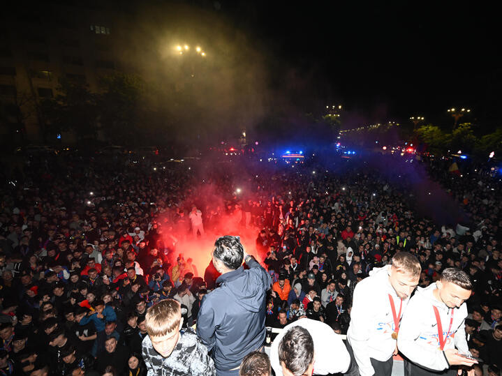 Descriere: Suporterii ros-albastrii, alături de torte si fumigene, celebreaza castigarea Superligii Superbet de catre favoritii lor FCSB in Piata Constitutiei din Bucuresti, sambata 17 mai 2025. © FOTO:Razvan Pasarica/SPORT PICTURES