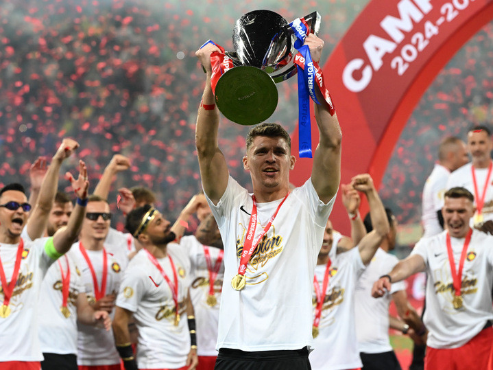 Descriere: Fotbalistii ros-albastrii alături de Ștefan Târnovanu celebreaza castigarea Superligii Superbet in urma meciului dintre FCSB si Universitatea Craiova, din cadrul Play off-ului competitiei, desfasurat pe Arena Nationala din Bucuresti, sambata 17 mai 2025. © FOTO:Razvan Pasarica/SPORT PICTURES