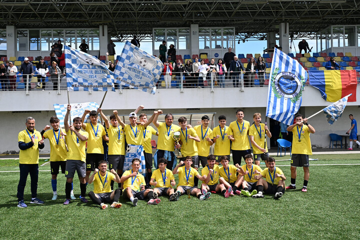 Descriere: Fotbalistii buzoieni se bucura dupa castigarea trofeului in urma meciului de fotbal dintre LPS Suceava U19 si Metalul Buzau U19, finala Cupa National U19, desfasurat pe Terenul sintetic din cadrul Centrului National de Fotbal din Buftea, marti 26 mai 2025. © FOTO:Razvan Pasarica/SPORT PICTURES
