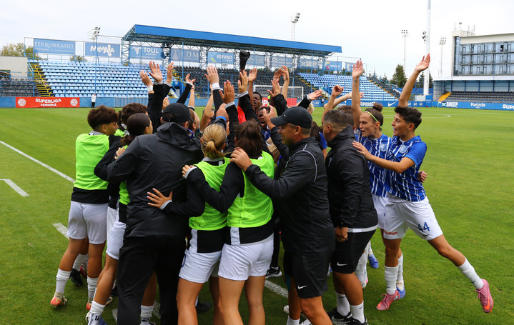 Descriere: Fotbalistele constantene se incurajeaza inaintea meciului de fotbal feminin dintre Farul Constanta si HB Køge, contand pentru UEFA Europa Cup, desfasurat pe terenul central din cadrul Academiei Gheorghe Hagi din Ovidiu, miercuri 17 septembrie 2025. © FOTO: Sorin Danielciuc/SPORT PICTURES