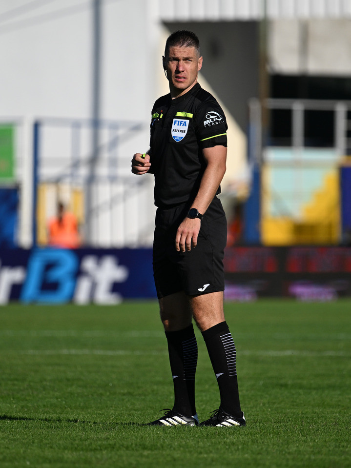Descriere: Arbitrul central Szabocs Kovacs reactioneaza in meciul dintre Unirea Slobozia si Petrolul Ploiesti, contand pentru Superliga Superbet, desfasurat pe Clinceni Arena din Clinceni, duminica 21 septembrie 2025. © FOTO:Razvan Pasarica/SPORT PICTURES