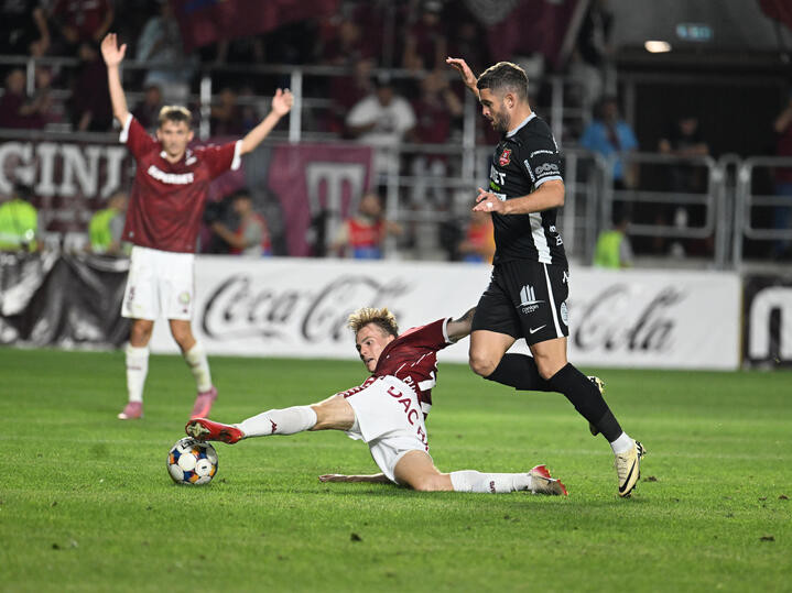 Descriere: Tobias Christensen si Sergiu Florin Bus in meciul de fotbal dintre Rapid Bucuresti si FC Hermannstadt, din cadrul Superligii Superbet, desfasurat pe Superbet Arena-Giulesti din Bucuresti, duminica 21 septembrie 2025. © FOTO:Razvan Pasarica/SPORT PICTURES