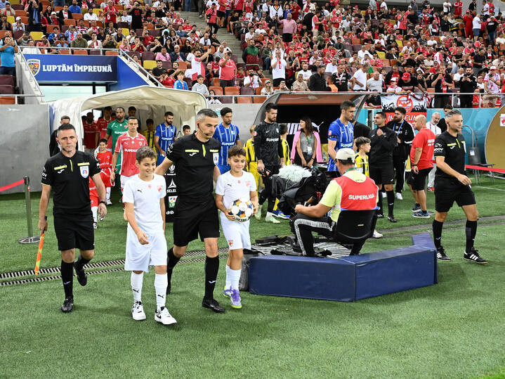 Descriere: Brigada de arbitri formată din Adrian Popescu, Florin Andrei si Alexandru Voda alături de căpitanii Catalin Ionut Cirjan si Ionuț Justinian Larie in meciul de fotbal dintre Dinamo Bucuresti si Farul Constanta, din cadrul Superligii Superbet, desfasurat pe Arena Nationala din Bucuresti, luni 22 septembrie 2025. © FOTO:Razvan Pasarica/SPORT PICTURES