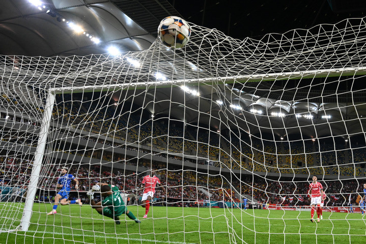 Descriere: Diogo Sa Ramalho marchează un gol în poarta lui Devis Rogers Epassy Mboka de langa Mamoudou Karamoko si Raul Marian Oprut in meciul de fotbal dintre Dinamo Bucuresti si Farul Constanta, din cadrul Superligii Superbet, desfasurat pe Arena Nationala din Bucuresti, luni 22 septembrie 2025. © FOTO:Razvan Pasarica/SPORT PICTURES