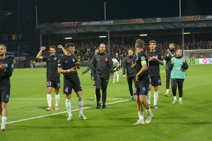 Descriere: Fotbalistii ros-albastrii saluta galeria dupa meciul de fotbal dintre Go Ahead Eagles si FCSB, contand pentru UEFA Europa League, desfasurat la Stadion De Adelaarshorst din Deventer, joi 25 septembrie 2025. © FOTO:Alexandra Cristina Grigorescu/SPORT PICTURES