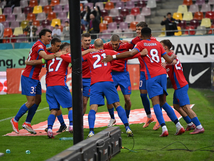 Descriere: Hora a bucuriei ros albastre cu Risto Radunovic, Juri Cisotti, Florin Lucian Tănase, George Daniel Bîrligea si Alexandru Constantin Stoian dupa un gol marcat in meciul dintre FCSB si Otelul Galati, contand pentru Superliga Superbet, desfasurat pe Arena Nationala din Bucuresti, duminica 28 septembrie 2025. © FOTO:Razvan Pasarica/SPORT PICTURES