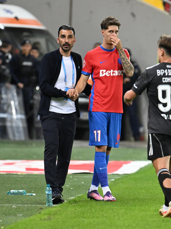 Descriere: Elias Charalambous il incurajeaza pe David Raul Miculescu inainte de intrarea in teren la meciul dintre FCSB si Otelul Galati, contand pentru Superliga Superbet, desfasurat pe Arena Nationala din Bucuresti, duminica 28 septembrie 2025. © FOTO:Razvan Pasarica/SPORT PICTURES