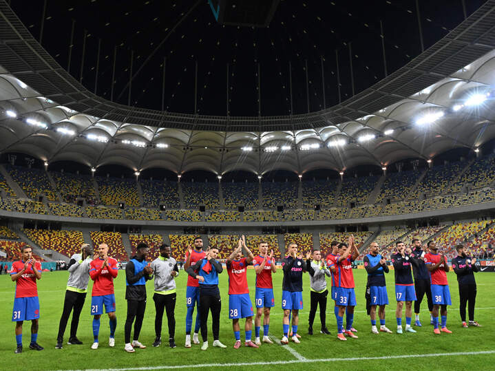 Descriere: Fotbalistii ros-albastrii Juri Cisotti, Baba Alhassan, Vlad Iulian Chiricheș, Enagnon David Kiki, Mamadou Thiam, Malcolm Sylas Laouari Edjouma, Dennis Dorin Politic, Grigoraș Alexandru Pantea, Florin Lucian Tănase, George Daniel Bîrligea, Alexandru Constantin Stoian, Mihai Vlăduț Toma, Risto Radunovic, David Raul Miculescu, Denis Alibec, Mihai Popescu, Juri Cisotti, Lukas Zima si Mihai Răzvan Udrea saluta galeria dupa meciul dintre FCSB si Otelul Galati, contand pentru Superliga Superbet, desfasurat pe Arena Nationala din Bucuresti, duminica 28 septembrie 2025. © FOTO:Razvan Pasarica/SPORT PICTURES