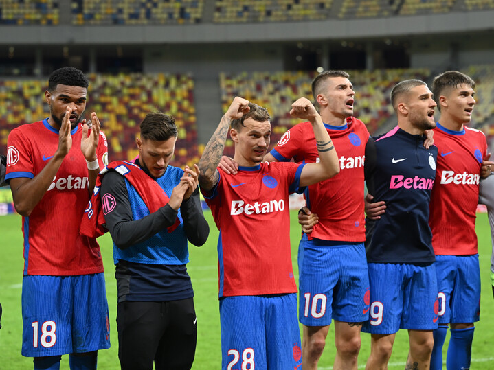 Descriere: Fotbalistii ros-albastrii Malcolm Sylas Laouari Edjouma, Dennis Dorin Politic, Grigoraș Alexandru Pantea, Florin Lucian Tănase, George Daniel Bîrligea si Alexandru Constantin Stoian saluta galeria dupa meciul dintre FCSB si Otelul Galati, contand pentru Superliga Superbet, desfasurat pe Arena Nationala din Bucuresti, duminica 28 septembrie 2025. © FOTO:Razvan Pasarica/SPORT PICTURES