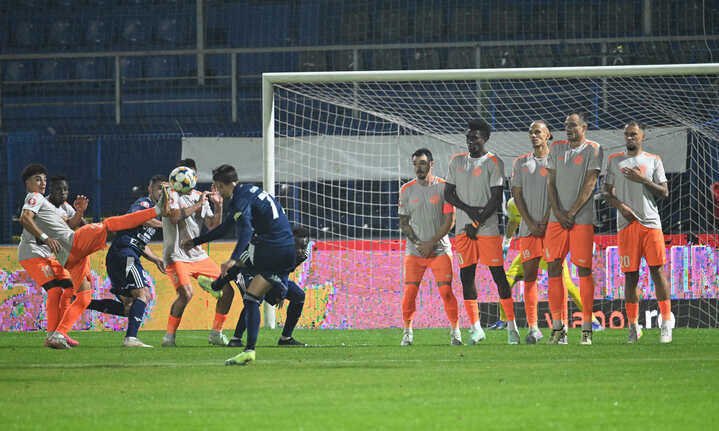 Descriere: George Alexandru Cimpanu marcheaza un gol din lovitura libera pe langa zidul format din Dragos Ionut Huiban, Ely Ernesto Lopes Fernandes, Omar Pasagic, George Alexandru Caramalau si Cornelis Petrus Ubbink si toata opozitia lui Christ Sarkodje Manca Kouadio si Yassine Mohammed Zakir in meciul de fotbal dintre Metaloglobus Bucuresti si FC Botosani, contand pentru Superliga Superbet, desfasurat pe Clinceni Arena din Clinceni, luni 29 septembrie 2025. © FOTO:Razvan Pasarica/SPORT PICTURES