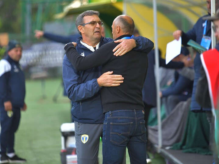 Descriere: Antrenorii celor doua echipe Bogdan Ioan Andone si Eugen Neagoe se saluta inaintea meciului de fotbal dintre FC Arges si FC Petrolul Ploiesti, contand pentru Superliga Superbet, desfasurat pe Stadionul Orasenesc din Mioveni,sambata 4 octombrie 2025. © FOTO:Mihai Nitoiu/SPORT PICTURES