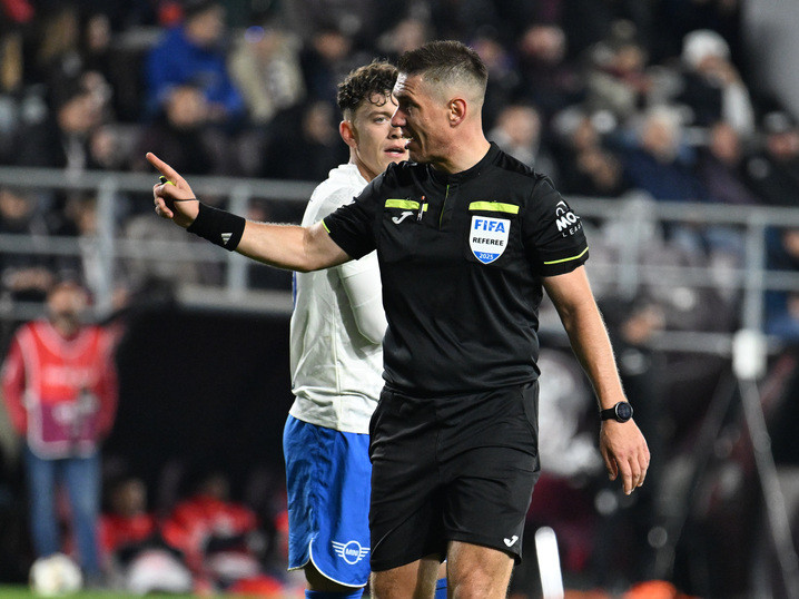 Descriere: Arbitrul central Szabolcs Kovacs reacționează in meciul de fotbal dintre Rapid Bucuresti si Farul Constanta, din cadrul Superligii Superbet, desfasurat pe Superbet Arena-Giulesti din Bucuresti, sambata 4 octombrie 2025. © FOTO:Razvan Pasarica/SPORT PICTURES