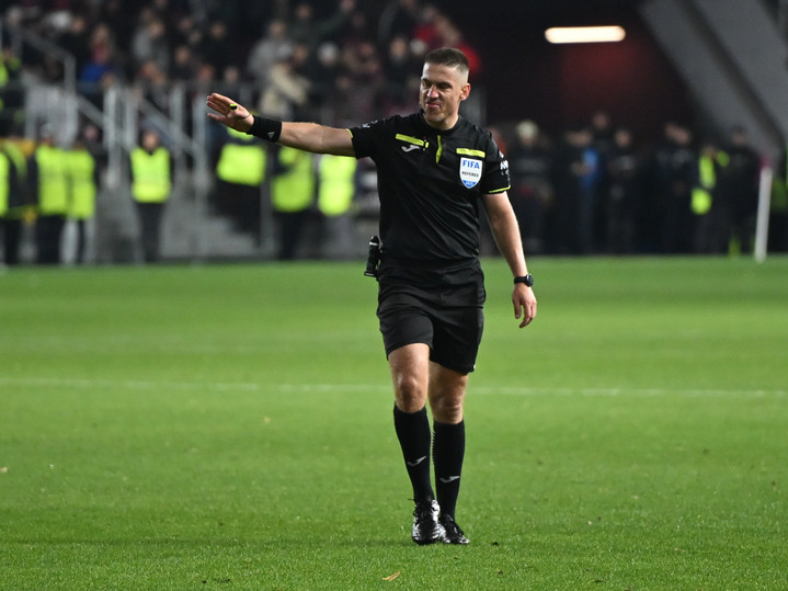 Descriere: Arbitrul central Szabolcs Kovacs reacționează in meciul de fotbal dintre Rapid Bucuresti si Farul Constanta, din cadrul Superligii Superbet, desfasurat pe Superbet Arena-Giulesti din Bucuresti, sambata 4 octombrie 2025. © FOTO:Razvan Pasarica/SPORT PICTURES