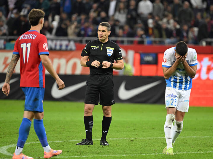 Descriere: Arbitrul central Istvan Kovacs reacționează alături de David Raul Miculescu si Samuel Teles Pereira Nunes Da Silva in meciul dintre FCSB si Universitatea Craiova, contand pentru Superliga Superbet, desfasurat pe Arena Nationala din Bucuresti, duminica 5 octombrie 2025. © FOTO:Razvan Pasarica/SPORT PICTURES