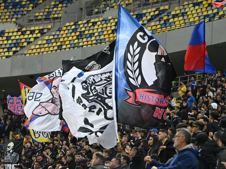 Descriere: Steaguri ros albastre fluturate in peluza la meciul dintre FCSB si Universitatea Craiova, contand pentru Superliga Superbet, desfasurat pe Arena Nationala din Bucuresti, duminica 5 octombrie 2025. © FOTO:Razvan Pasarica/SPORT PICTURES