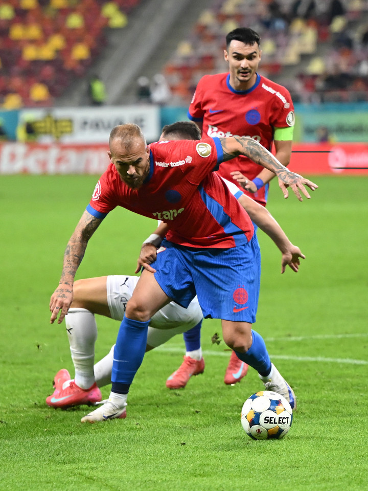 Descriere: Fotbalistii ros-albastrii Denis Alibec si Adrian Gheorghe Șut in meciul dintre FCSB si Universitatea Craiova, contand pentru Superliga Superbet, desfasurat pe Arena Nationala din Bucuresti, duminica 5 octombrie 2025. © FOTO:Razvan Pasarica/SPORT PICTURES