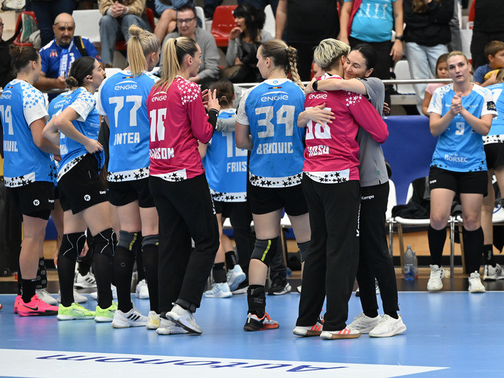 Descriere: Alina Iordache o imbratiseaza pe Daciana Hosu dupa meciul de handbal feminin dintre CSM Bucuresti si HC Podravka Koprivnica, din cadrul Ligii Campionilor, desfasurat in Sala Dinamo din Bucuresti, duminica 5 octombrie 2025. © FOTO:Razvan Pasarica/SPORT PICTURES