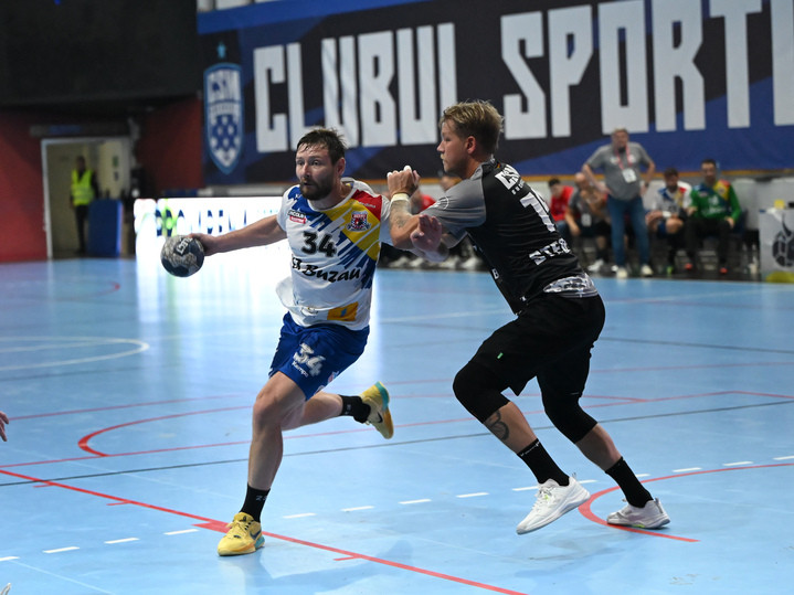 Descriere: Vitaly Komogorov si Markus Hans Stegefelt in meciul de handbal masculin dintre CSM Bucuresti si HC Buzau, contand pentru Liga Zimbrilor, desfasurat in Sala Apollo din Bucuresti, luni 6 octombrie 2025. © FOTO:Razvan Pasarica/SPORT PICTURES