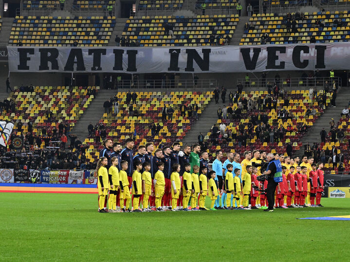 Descriere: Fotbalistii celor doua echipe alaturi de brigada de arbitrii la startul meciului amical de fotbal dintre Romania si Moldova, desfasurat pe Arena Nationala din Bucuresti, joi 9 octombrie 2025. © FOTO:Razvan Pasarica/SPORT PICTURES