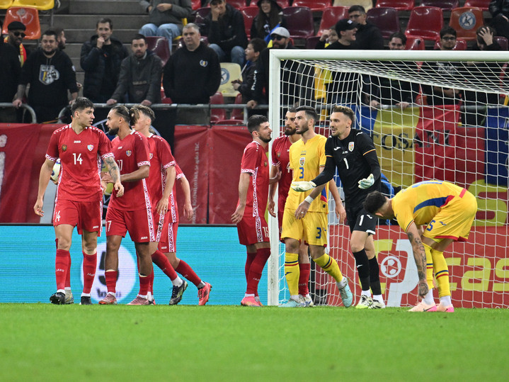 Descriere: Artur Craciun, Virgiliu Postolachi, Ion Bors, Vladislav Baboglo, Mihai Popescu si Ionut Radu dupa un gol moldovenesc reusit in meciul amical de fotbal dintre Romania si Moldova, desfasurat pe Arena Nationala din Bucuresti, joi 9 octombrie 2025. © FOTO:Razvan Pasarica/SPORT PICTURES