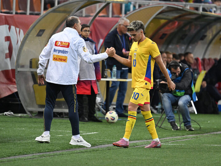 Descriere: Ionel Tersinio Gane il felicita pe Ianis Hagi la iesirea de pe teren din meciul amical de fotbal dintre Romania si Moldova, desfasurat pe Arena Nationala din Bucuresti, joi 9 octombrie 2025. © FOTO:Razvan Pasarica/SPORT PICTURES