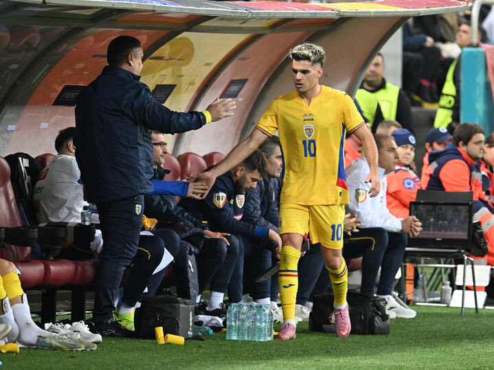 Descriere: Ianis Hagi felicitat la iesirea de pe teren din meciul amical de fotbal dintre Romania si Moldova, desfasurat pe Arena Nationala din Bucuresti, joi 9 octombrie 2025. © FOTO:Razvan Pasarica/SPORT PICTURES
