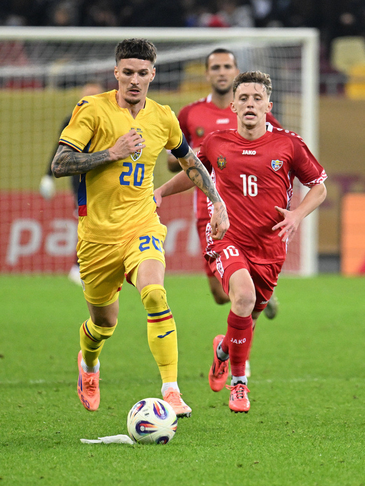 Descriere: Dennis Man si Danila Forov in meciul amical de fotbal dintre Romania si Moldova, desfasurat pe Arena Nationala din Bucuresti, joi 9 octombrie 2025. © FOTO:Razvan Pasarica/SPORT PICTURES