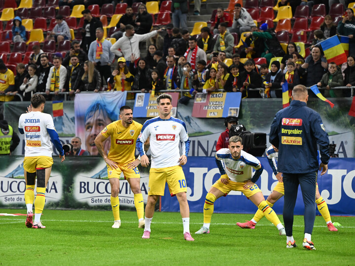 Descriere: Fotbalistii romani Andrei Burca, Ianis Hagi si Vlad Dragomir la incalzire inaintea meciului de fotbal dintre Romania si Austria, din cadrul Preliminariilor Campionatului Mondial 2026, desfasurat pe Arena Nationala din Bucuresti, duminica 12 octombrie 2025. © FOTO:Razvan Pasarica/SPORT PICTURES