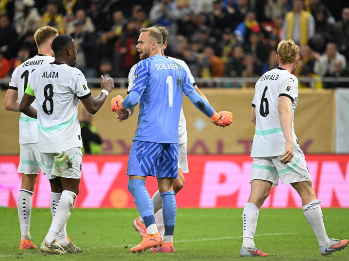 Descriere: Alexander Schlager este felicitat de colegi dupa o interventie avuta la meciul de fotbal dintre Romania si Austria, din cadrul Preliminariilor Campionatului Mondial 2026, desfasurat pe Arena Nationala din Bucuresti, duminica 12 octombrie 2025. © FOTO:Razvan Pasarica/SPORT PICTURES