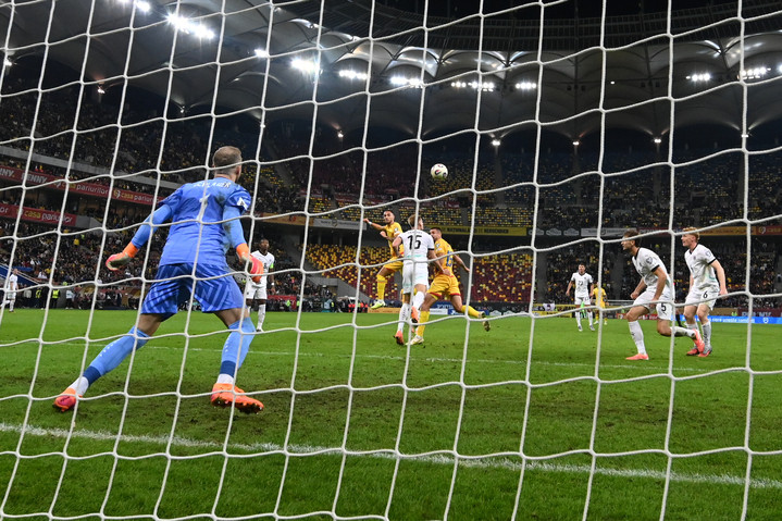Descriere: Virgil Ghita marcheaza un gol in poarta lui Alexander Schlager sub privirile lui Philipp Lienhart, Andrei Burca, Stefan Posch si Nicolas Seiwald la meciul de fotbal dintre Romania si Austria, din cadrul Preliminariilor Campionatului Mondial 2026, desfasurat pe Arena Nationala din Bucuresti, duminica 12 octombrie 2025. © FOTO:Razvan Pasarica/SPORT PICTURES