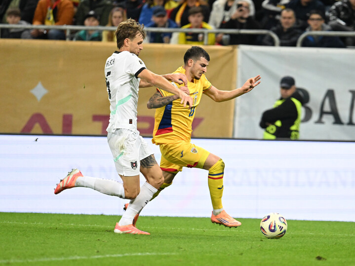 Descriere: Stefan Posch si Valentin Mihaila la meciul de fotbal dintre Romania si Austria, din cadrul Preliminariilor Campionatului Mondial 2026, desfasurat pe Arena Nationala din Bucuresti, duminica 12 octombrie 2025. © FOTO:Razvan Pasarica/SPORT PICTURES