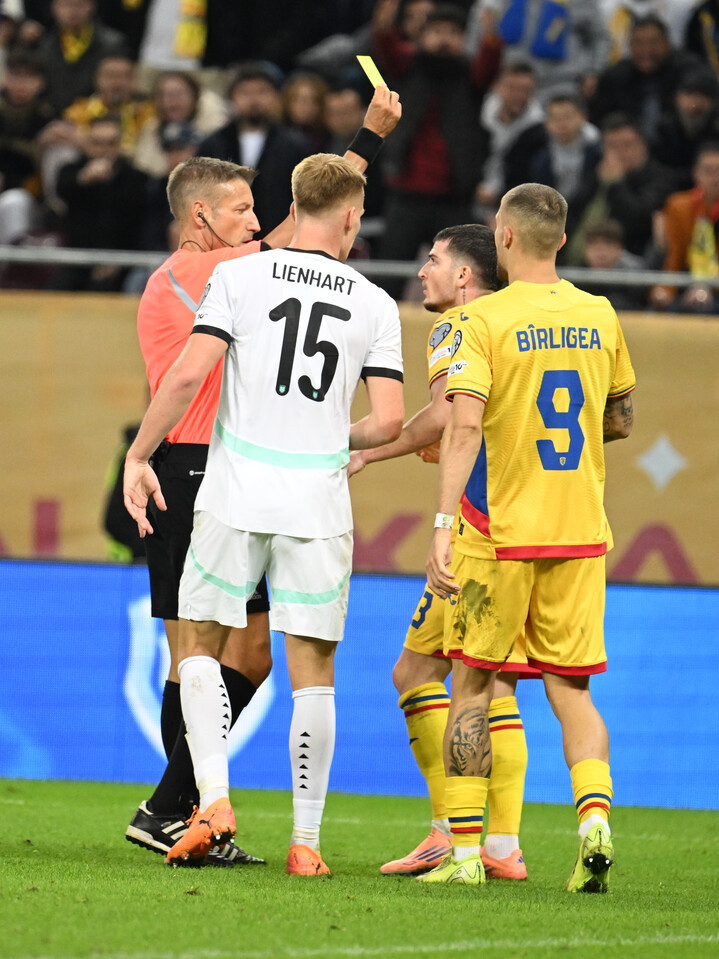 Descriere: Arbitrul central Davide Massa acorda un cartonas galben lui Valentin Mihaila la meciul de fotbal dintre Romania si Austria, din cadrul Preliminariilor Campionatului Mondial 2026, desfasurat pe Arena Nationala din Bucuresti, duminica 12 octombrie 2025. © FOTO:Razvan Pasarica/SPORT PICTURES