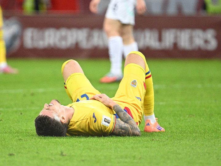 Descriere: Dennis Man la pamant la meciul de fotbal dintre Romania si Austria, din cadrul Preliminariilor Campionatului Mondial 2026, desfasurat pe Arena Nationala din Bucuresti, duminica 12 octombrie 2025. © FOTO:Razvan Pasarica/SPORT PICTURES