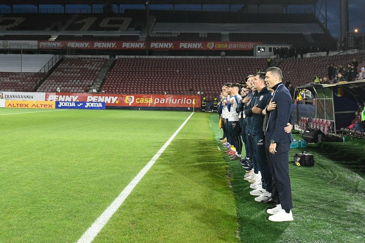 Descriere: Costin Curelea, staful tehnic si jucatorii de rezerva la intonarea imnului national inaintea meciului de fotbal dintre Romania U21 si Cipru U21, contand pentru Grupa A de calificare la Campionatul European U21 2027, desfasurat pe Stadionul Dr.Constantin Radulescu din Cluj-Napoca, marti 14 octombrie 2025. © FOTO:Flaviu Buboi/SPORT PICTURES