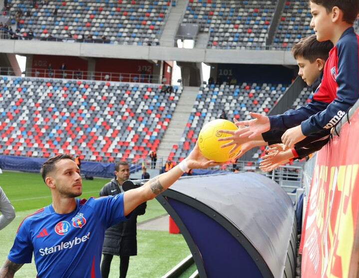 Descriere: Mihai Adascalitei ofera o minge copiilor prezenti in tribuna la meciul de fotbal de fotbal dintre Steaua Bucuresti si CSC 1599 Selimbar, contand pentru Liga 2 Casa Pariurilor, desfasurat la Stadionul Steaua-Ghencea din Bucuresti,sambata 18 octombrie 2025. © FOTO:SPORT PICTURES